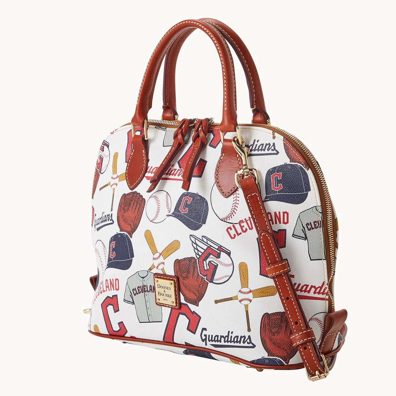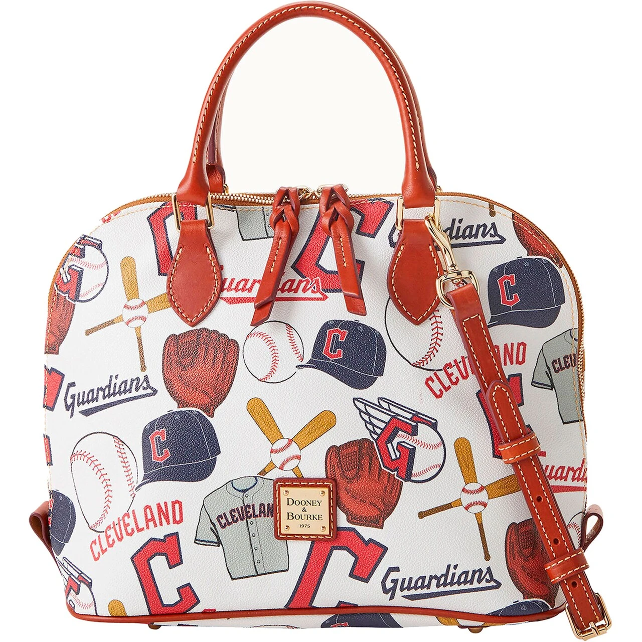 Flaunt your fashion sense and Cleveland Guardians devotion when you select this Game Day Zip Zip satchel from Dooney & Bourke. It features Cleveland Guardians-themed graphics printed all over with the sophisticated touch of leather trim. You also have the option of carrying around this chic purse by the double handles or adjustable shoulder strap that is detachable.